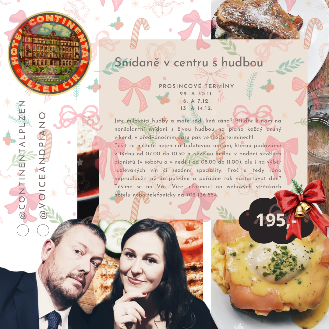 Vyhlášené snídaně ale historií nejsou a ve všední den podávají od sedmi do desíti, o víkendu od osmi do půl jedenácté, takže i ti, kteří si déle pospí, budou jistě spokojení. Je libo trochu nonšalance? Dejte si k snídani skleničku sektu a nechte se pohltit atmosférou a výjimečností adventních dnů. Jistě Vás potěší během víkendu i hudební doprovod v podání Voice and Piano. Cena bufetové snídaně zůstává 195,-/os.